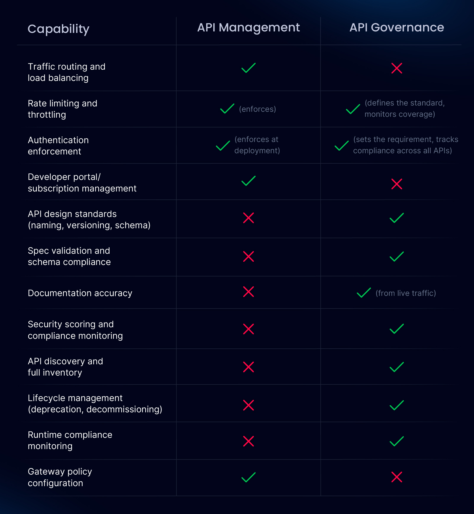 Neither discipline replaces the other. A well-governed API surface without management infrastructure has no control plane, while a well-managed API surface without governance has no standards.