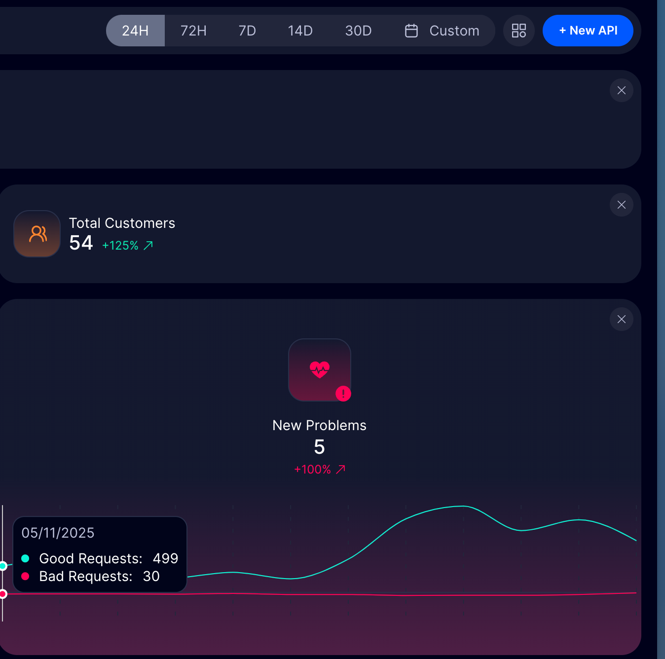 The platform's Endpoints, Customers, APIs, and Problems sections will always display complete data, while data shown in the individual cards is based on the time range selected. We improved readability and usability by adding more tooltips.
