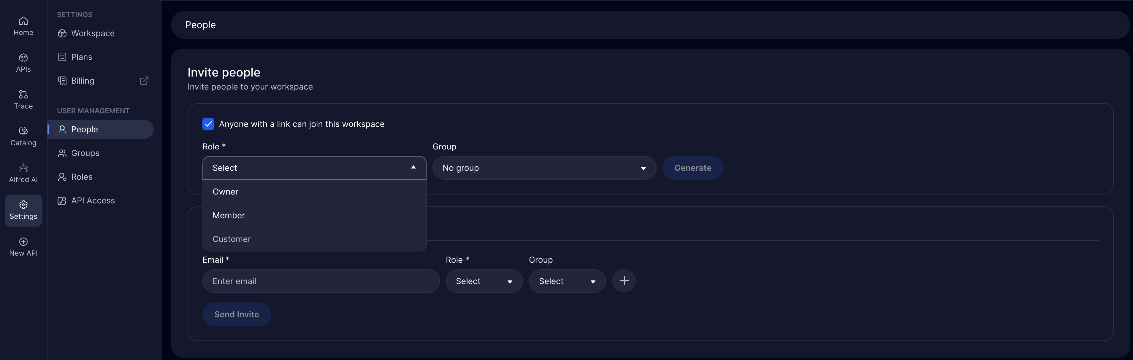 Invite anyone with a link to your workspace, assigning them a role and a group.